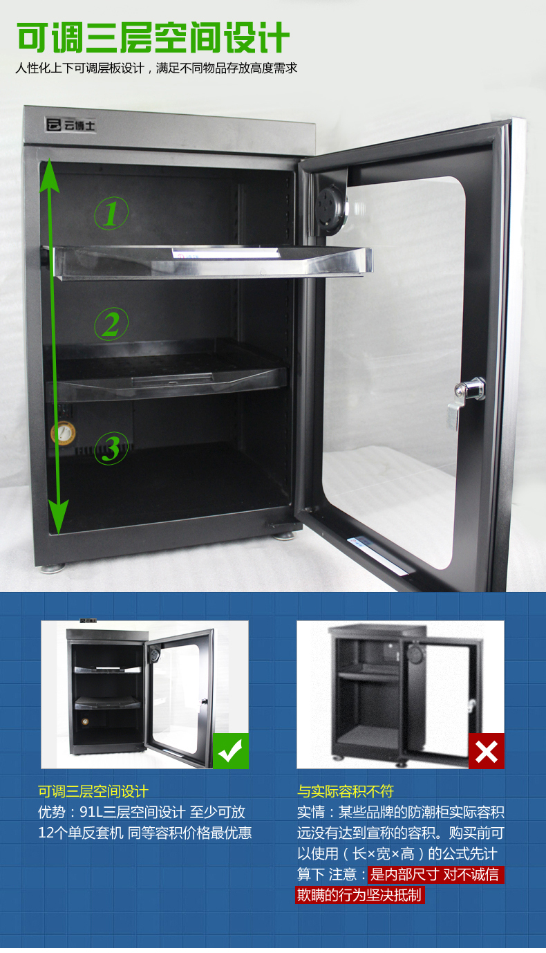 云博士CMX90B攝影防潮箱采用最新鈑金鐳射切割技術(shù),密封性能好,雙傳感器主機(jī)除濕更快,防潮效果佳,溫濕度顯示由德國進(jìn)口掛表顯示,梅雨季節(jié)防潮必備,此款為90L,2塊層板,2塊海綿墊,平面波浪各一塊,攝影器材存放更安全,深受攝影愛好者青睞,可存儲相機(jī)6-8個,鏡頭4-5個,我們專注攝影器材防潮,訂購電話:400-066-2279(免長途費(fèi))
