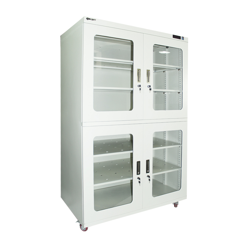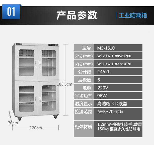 ?外寸(mm): W1200 x H1951 x D700 ?內(nèi)寸(mm): W1198 x H1795 x D698 ?全部采用觸摸按鍵,微電腦液晶顯示。 ?濕度范圍5%%RH以下可調(diào) ?1.2mm寶鋼材料結(jié)構(gòu),載重150kg。柜身永久性防靜電(選配)。 ?采用高分子材料吸濕,運(yùn)用『形狀記憶合金』系統(tǒng)除濕方法。