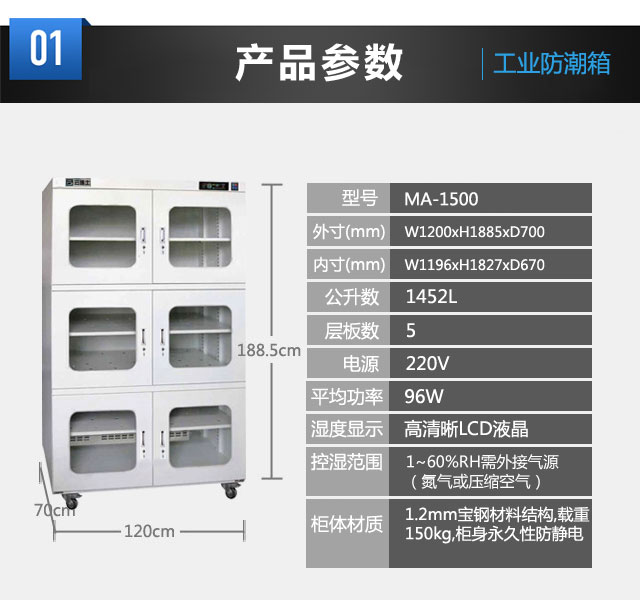 ?外寸(mm): W1200 x H1951 x D700 ?內(nèi)寸(mm): W1198 x H1795 x D698 ?全部采用觸摸按鍵,微電腦液晶顯示。 ?1%~60%RH濕度范圍,需外接電源(氮?dú)饣驂嚎s空氣)。 ?1.2mm寶鋼材料結(jié)構(gòu),載重150kg。柜身永久性防靜電(選配)。 ?采用高分子材料吸濕,運(yùn)用『形狀記憶合金』系統(tǒng)除濕方法。