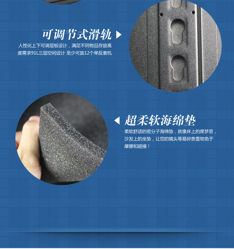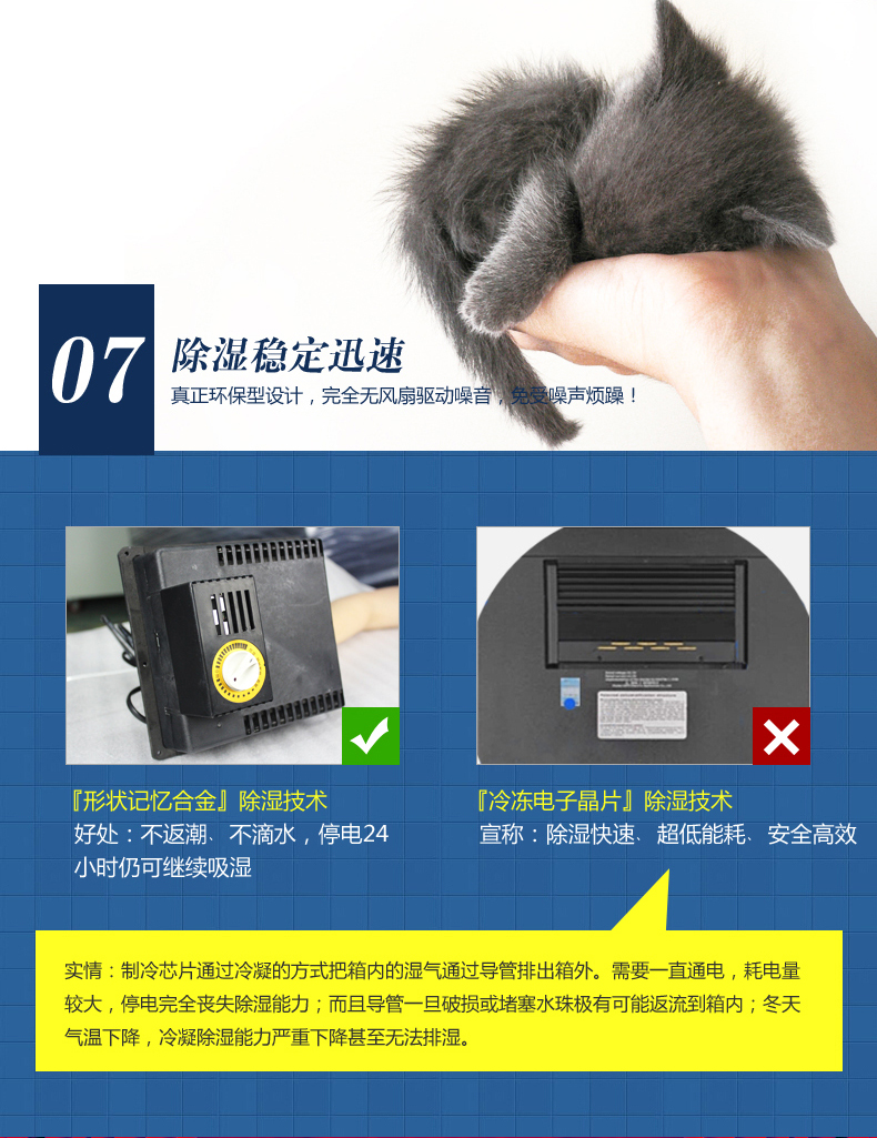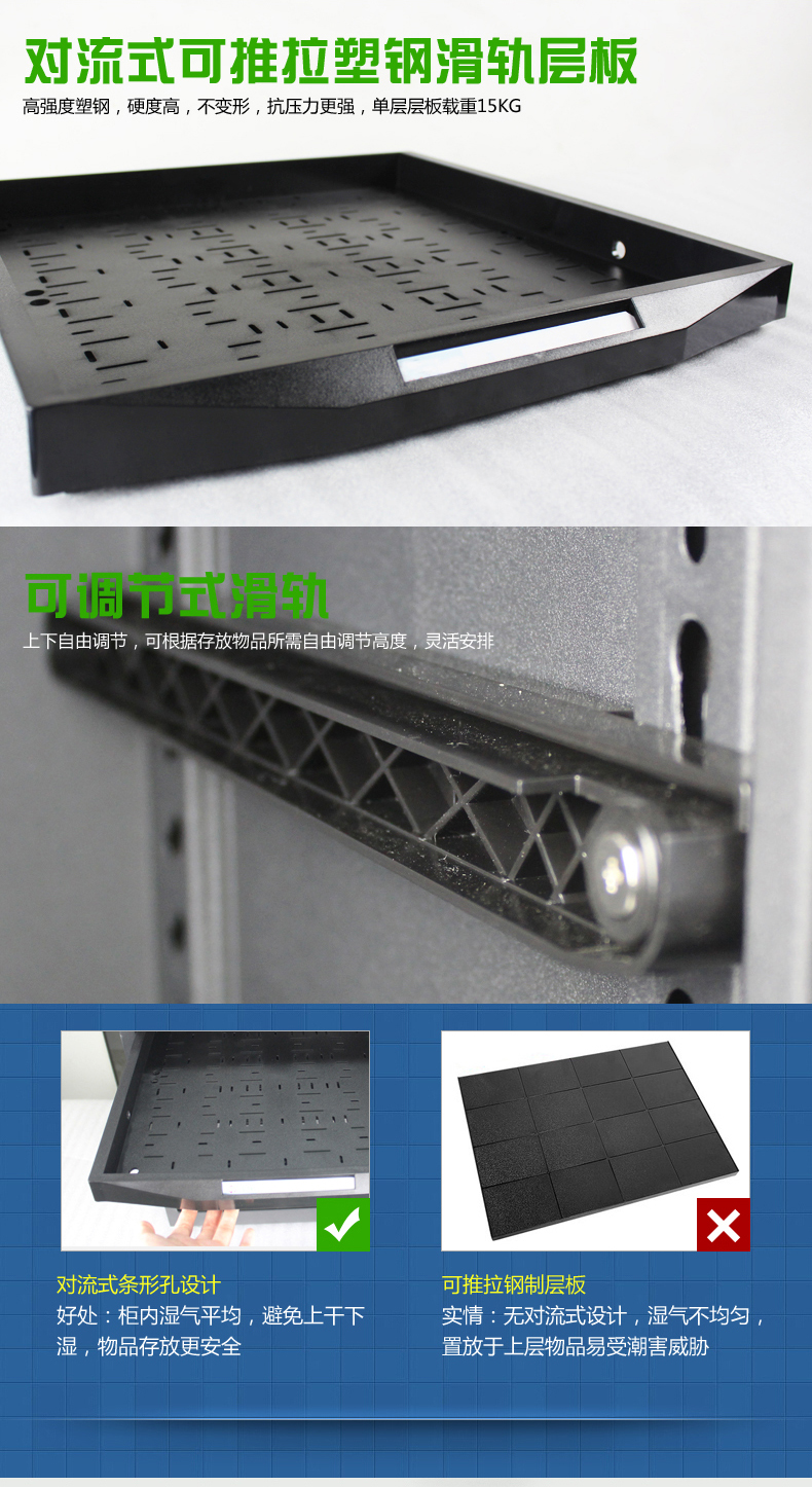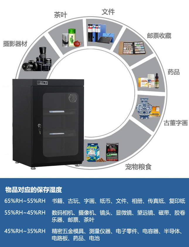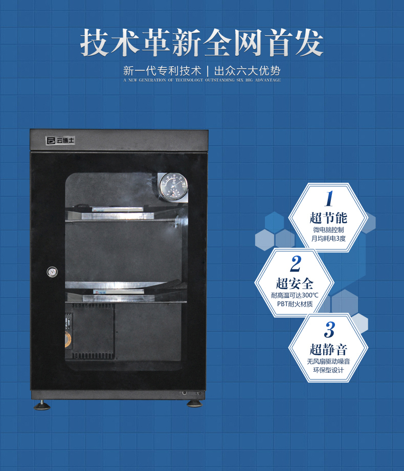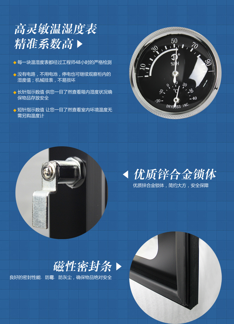 云博士CMX90B攝影防潮箱采用最新鈑金鐳射切割技術(shù),密封性能好,雙傳感器主機除濕更快,防潮效果佳,溫濕度顯示由德國進口掛表顯示,梅雨季節(jié)防潮必備,此款為90L,2塊層板,2塊海綿墊,平面波浪各一塊,攝影器材存放更安全,深受攝影愛好者青睞,可存儲相機6-8個,鏡頭4-5個,我們專注攝影器材防潮,訂購電話:400-066-2279(免長途費)