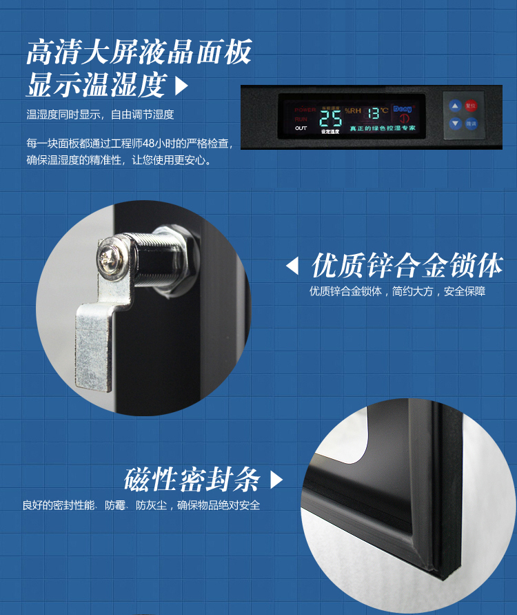 云博士CMX120C攝影防潮箱采用最新鈑金鐳射切割技術(shù),密封性能好,雙傳感器主機(jī)除濕更快,防潮效果佳,溫濕度顯示由原裝進(jìn)口液晶顯示,梅雨季節(jié)防潮必備,此款為115L,大容量,專業(yè)攝影器材控,3塊層板,3塊海綿墊,平面2塊,波浪1塊,攝影器材存放更安全,我們專注攝影器材防潮,訂購電話:400-066-2279(免長途費(fèi))